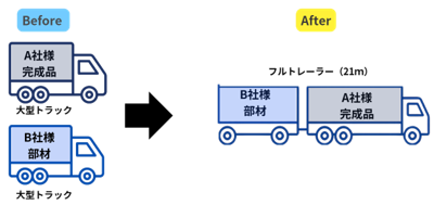 従来それぞれ単独で行っていた輸送を組み合わせ、21mフルトレーラーにて混載。